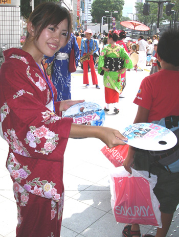 集客方法は折込チラシの他、実施現場付近で、“ちんどんや” “浴衣スタッフ”による、うちわのサンプリングを実施。